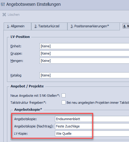 Damit können Sie nun die Kalkulationsmethode bei der Angebotskopie, Angebotskopie (als Nachtrag) und LV-Kopie bestimmen.