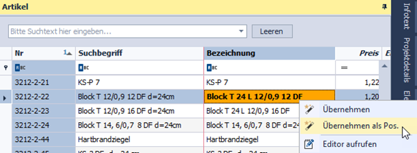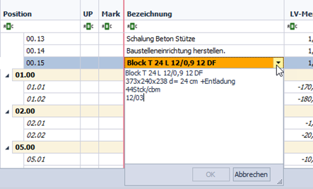 Nach Übernahme des Artikels als Position, wird dieser im Leistungsverzeichnis nun mit allen Bezeichnungen (Bezeichnungen 1-4) übernommen.