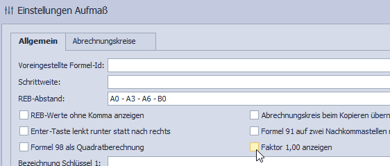 Die Einstellungen des Aufmaßeditors wurden um das Feld „Faktor 1,00 anzeigen“ erweitert: